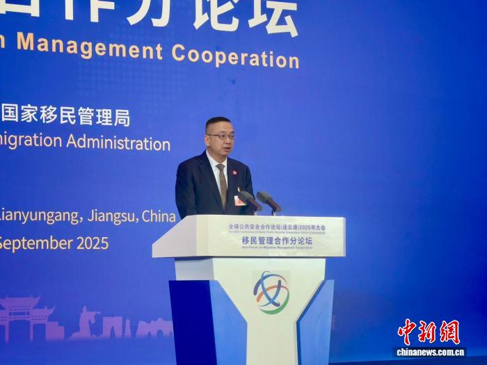 9月17日,全球公共安全合作论坛(Lianyungang)的2025会议在江苏省的Lianyung City开放。图片显示,香港特殊行政区政府移民事务部主任郭·朱芬(Guo Junfeng)在移民管理合作副理事的全体会议上发表了演讲。 (由香港特别行政区政府信息办公室提供的照片)