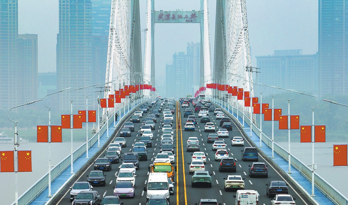 这些车辆在周三的国庆假期第一天,越过了湖北省武汉的第二桥,各个地区的交通流量达到了高峰。 xiao yijiu/xinhua